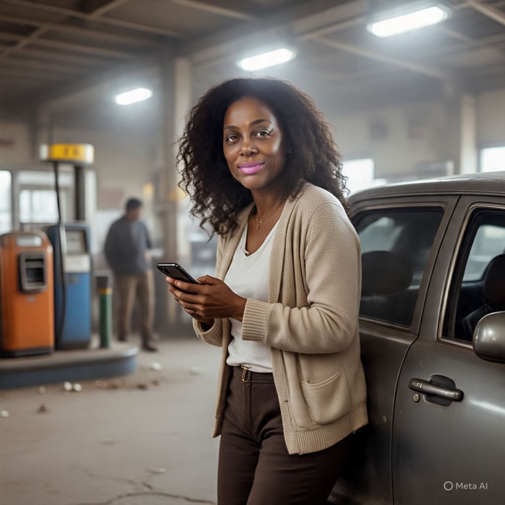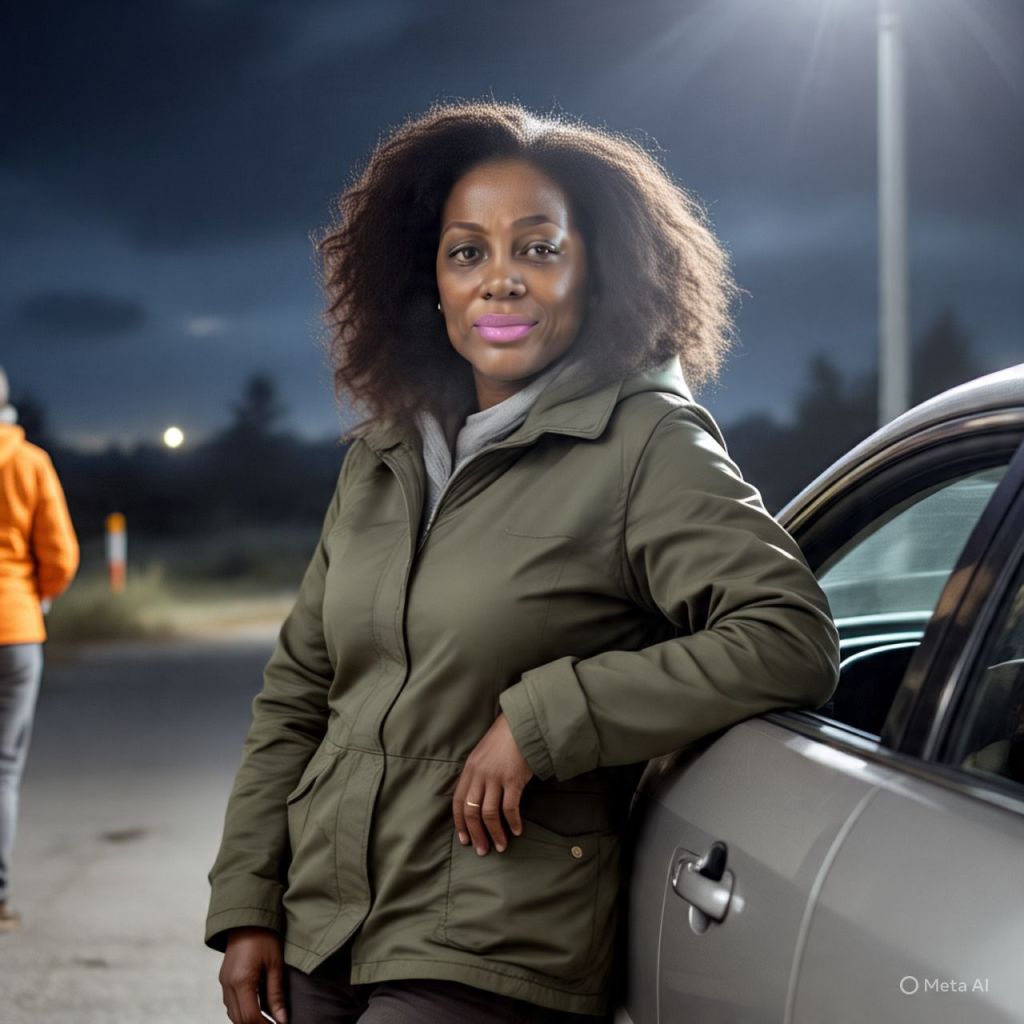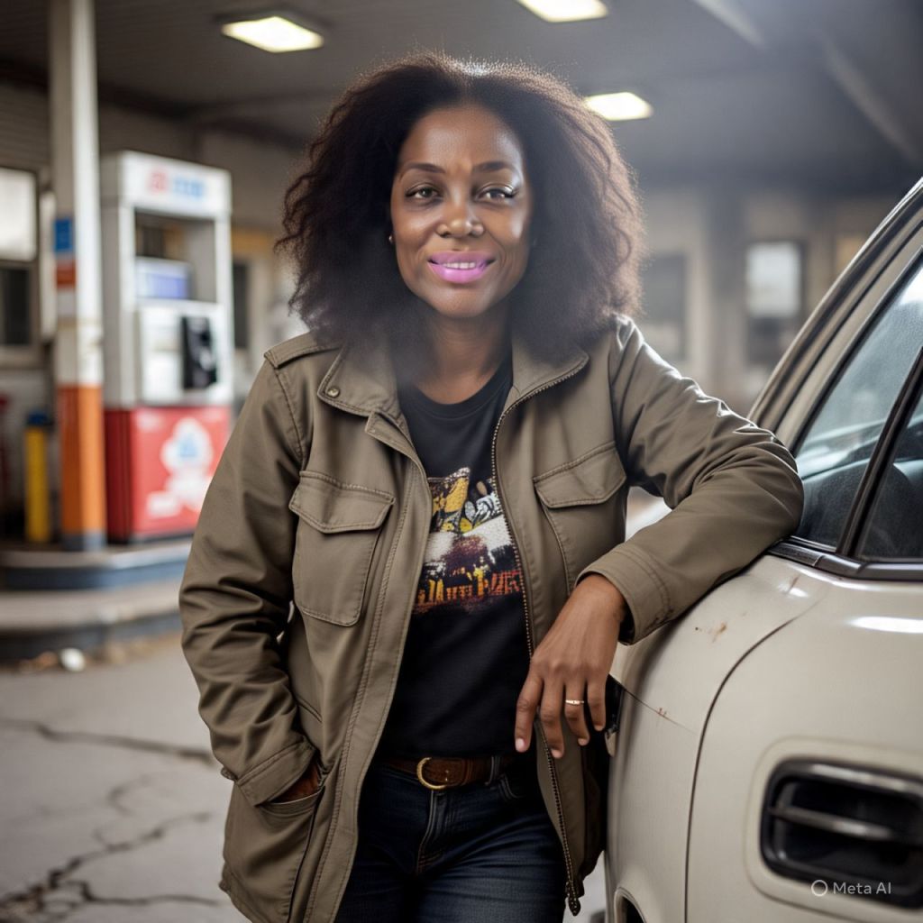 Antoinette (32, alert and fierce) leans against the car, watching the people around her closely.