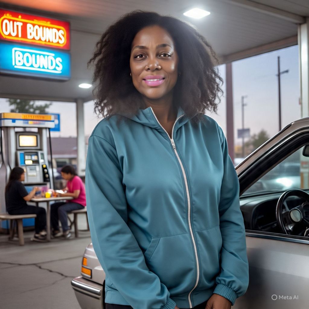 The camera pans across a dimly lit gas station off Route 380. The fluorescent lights flicker, casting eerie shadows across the cracked pavement. A radio hums quietly with static and old rock tunes.