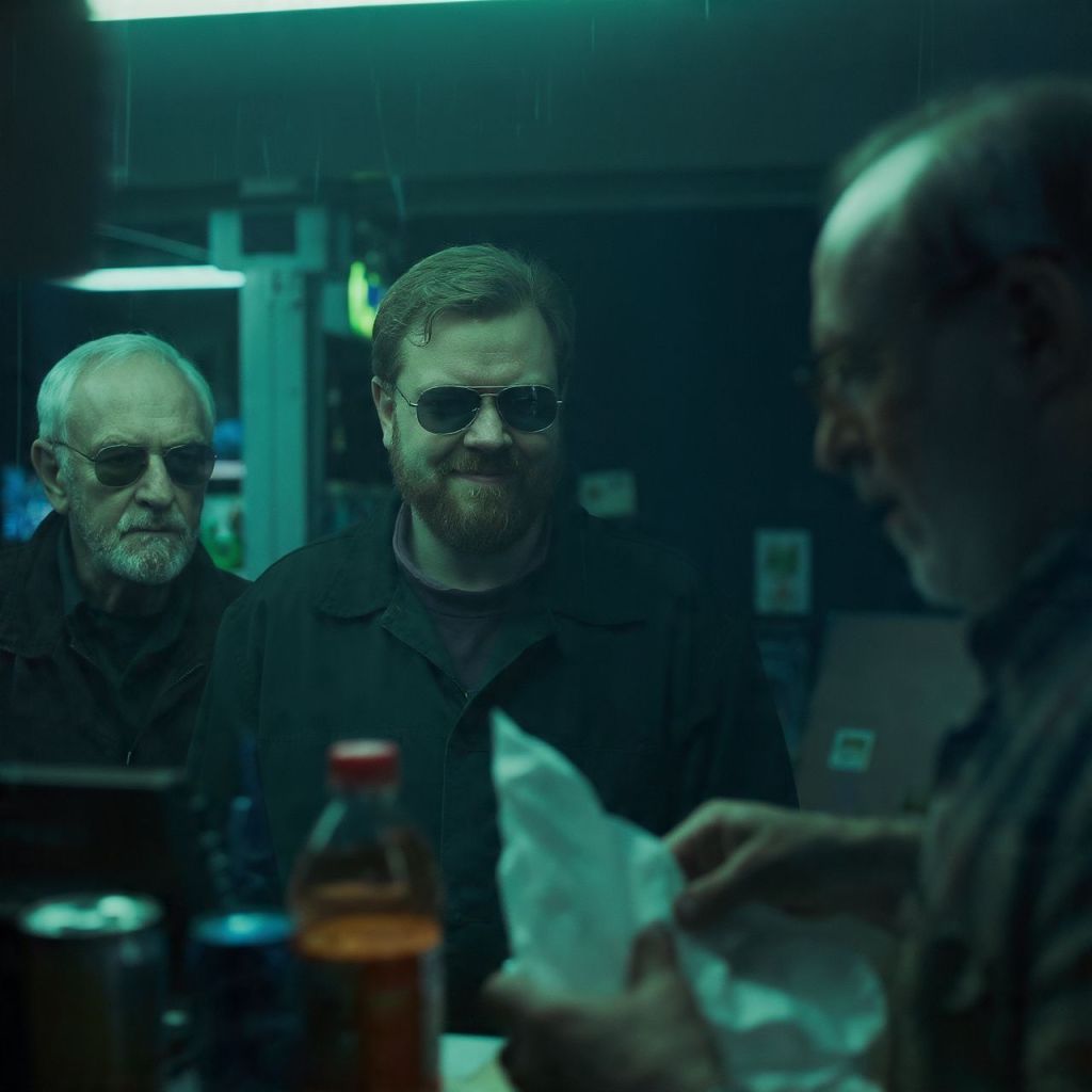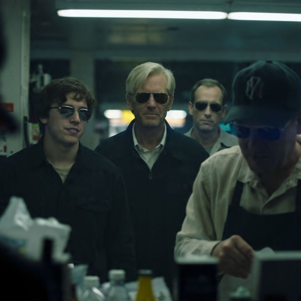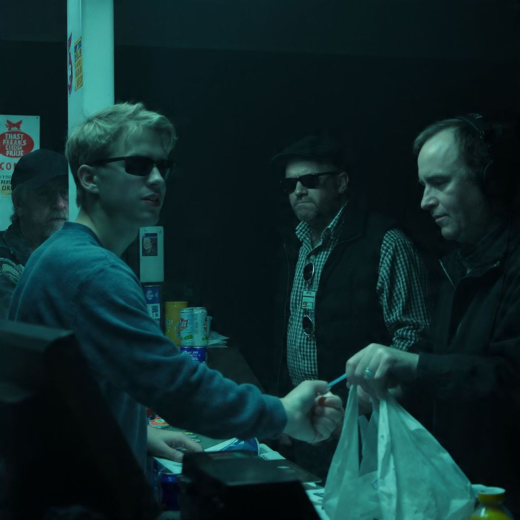 The camera zooms in on the cashier’s uneasy face. He laughs nervously, but his hand shakes as he bags their drinks.