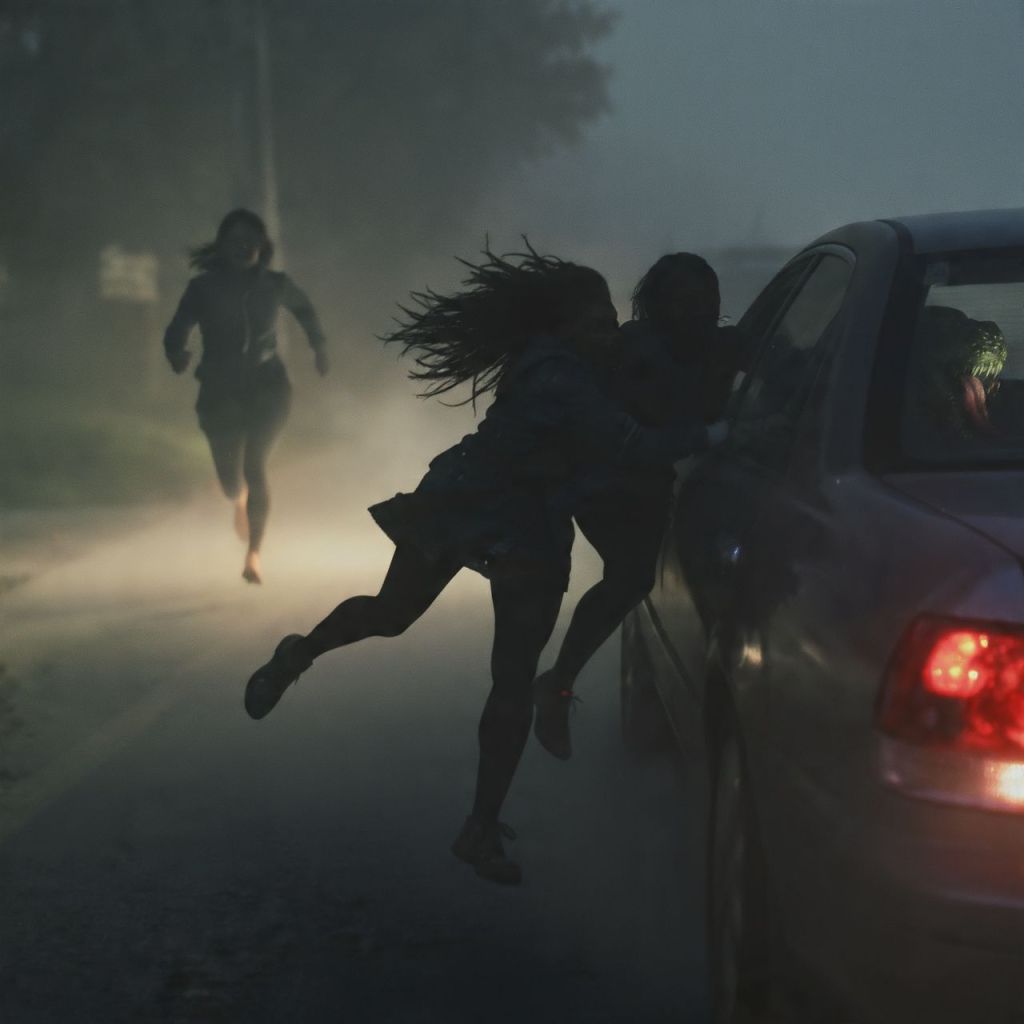 They jump into the car — tires screech, headlights slice through fog.
