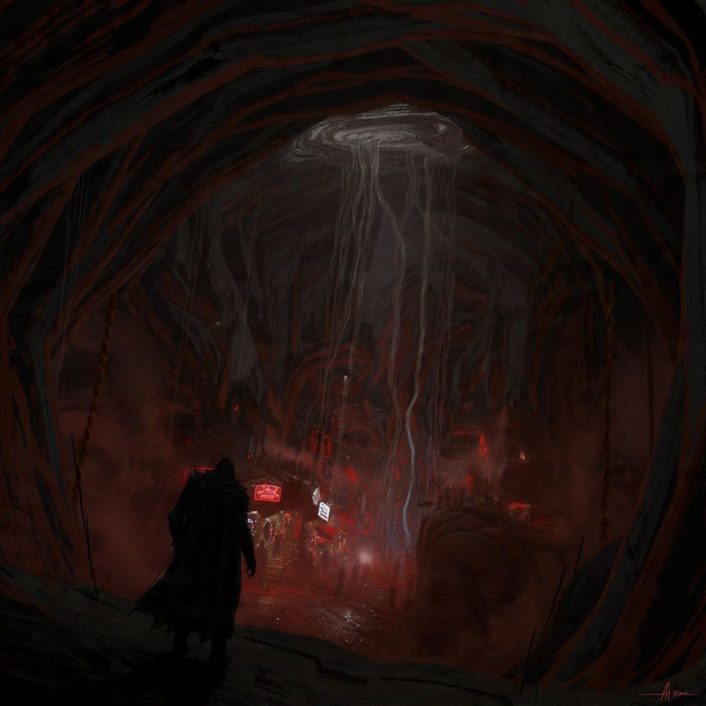 We see the underground city glowing red — full of vampires and reptilians mingling like humans.