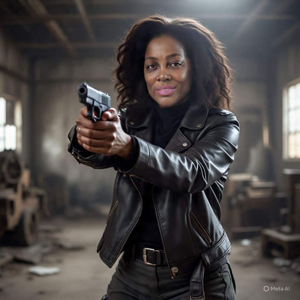 Tasha fires first, hitting the officer in the shoulder.