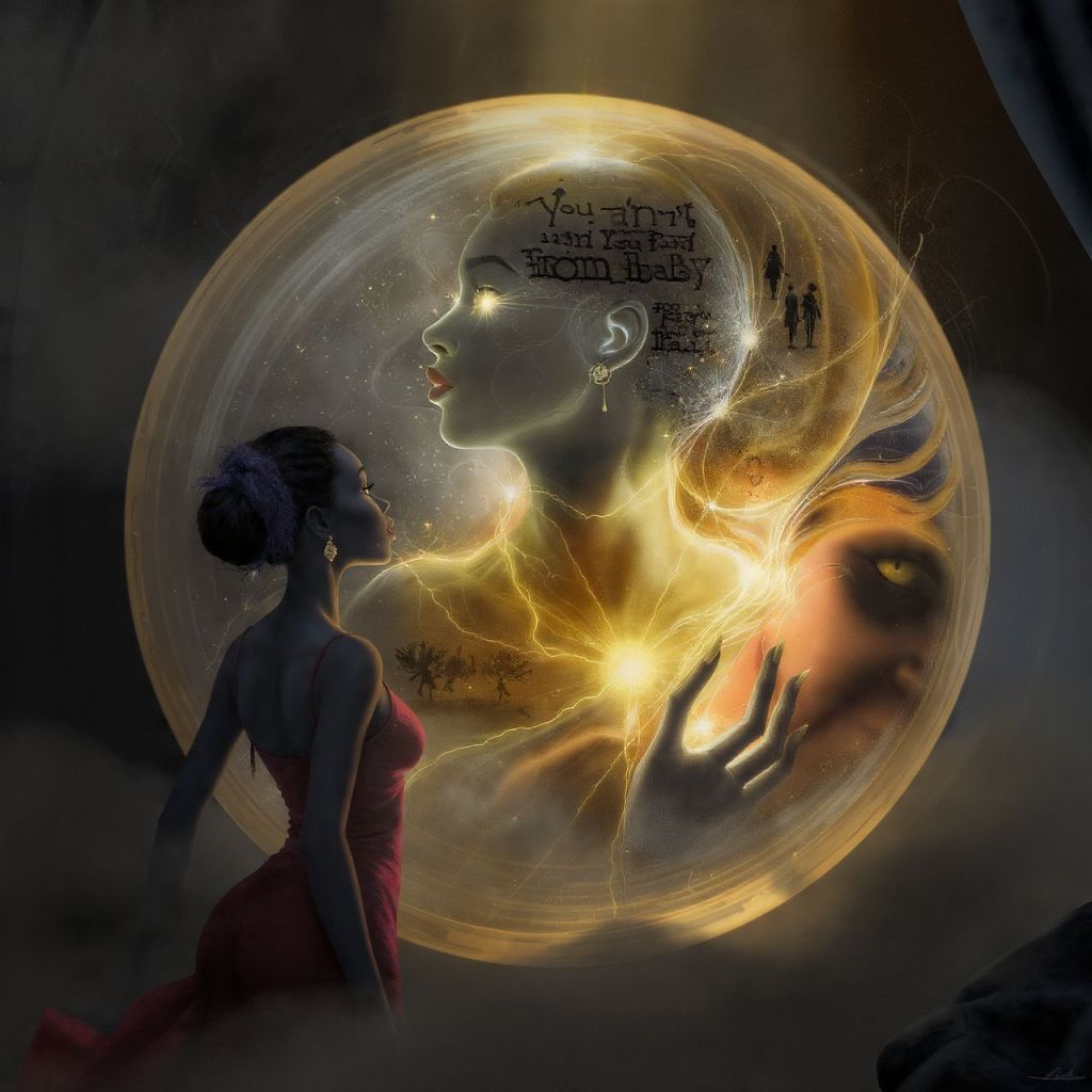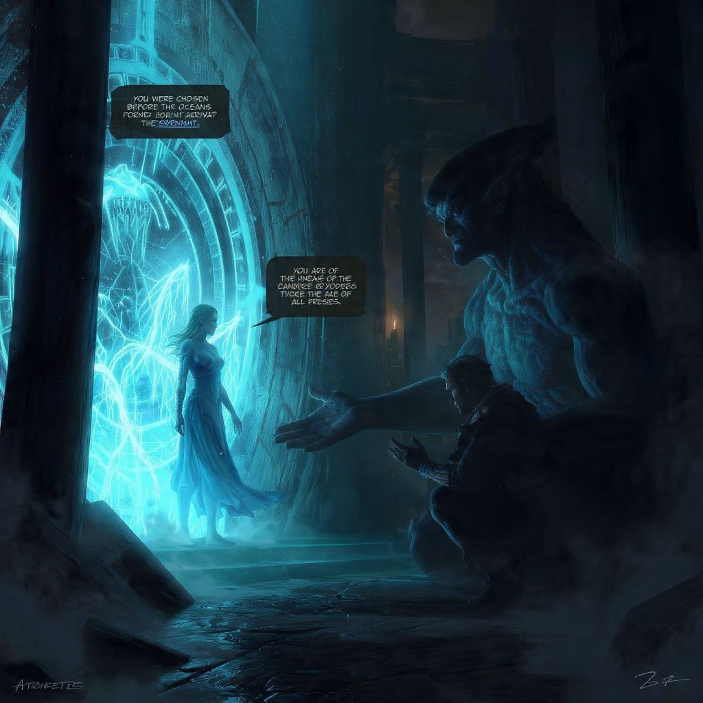 Her eyes reflect a glowing underwater kingdom stretching miles in every direction — massive crystal towers, floating lanterns, and symbols etched into the seafloor that pulse the same golden color as her DNA.