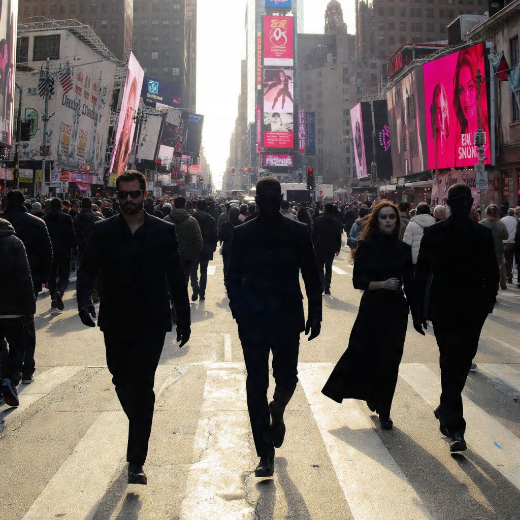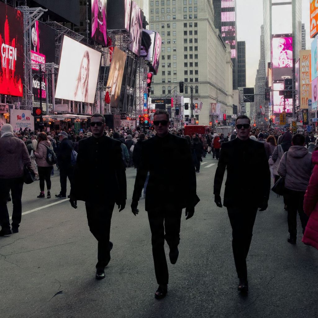 But three men in all-black outfits and dark shades move unnaturally smooth.