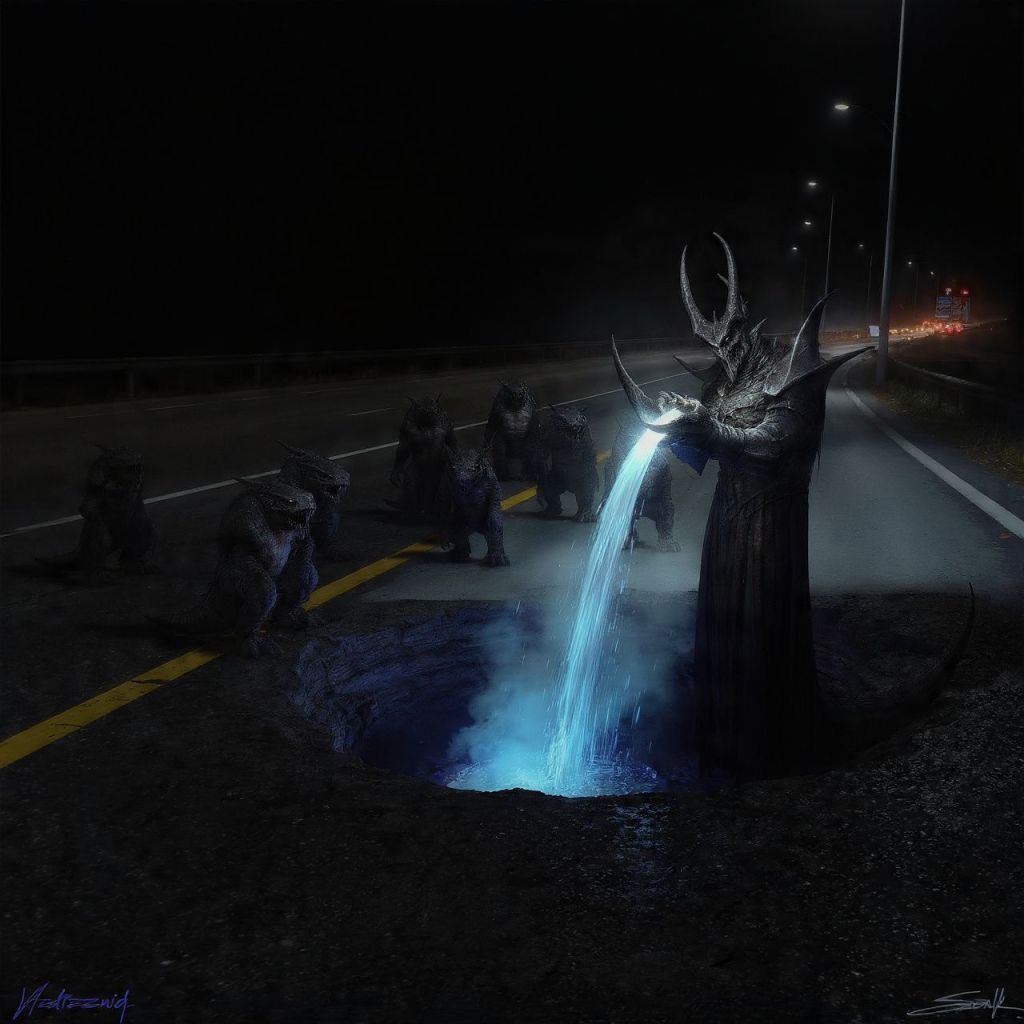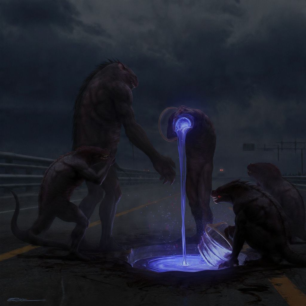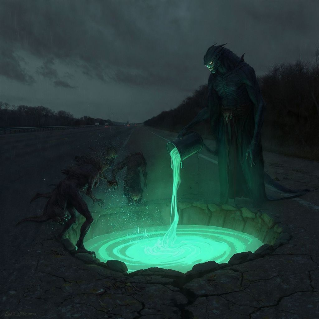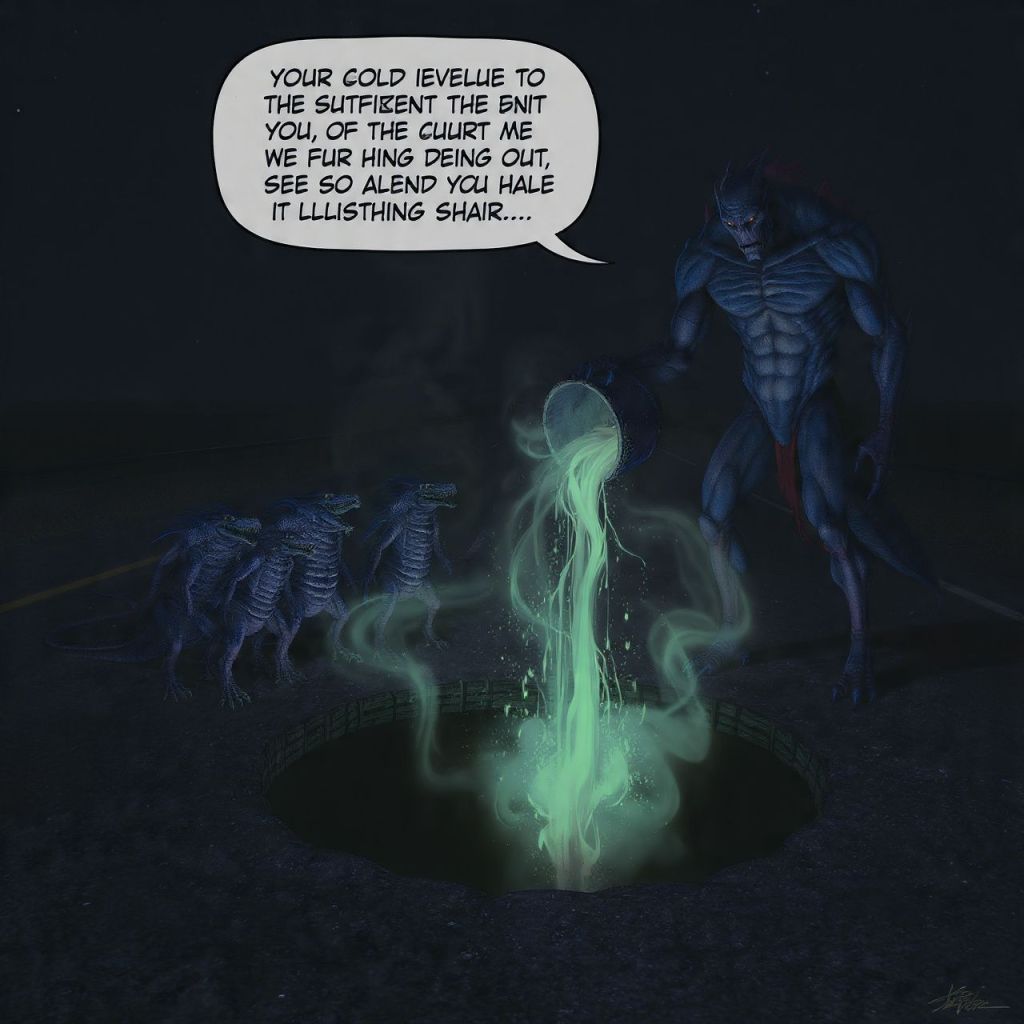 A group of vampire-reptilian hybrids stand around the exact hole Antoinette fell victim to.