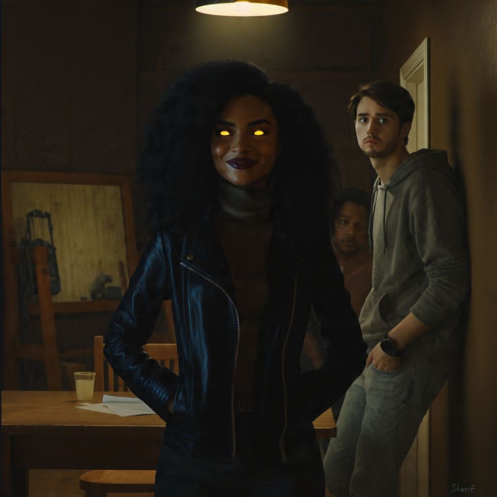 When Antoinette steps forward, the figure steps back into the dark — but its eyes stay visible, glowing like molten amber.