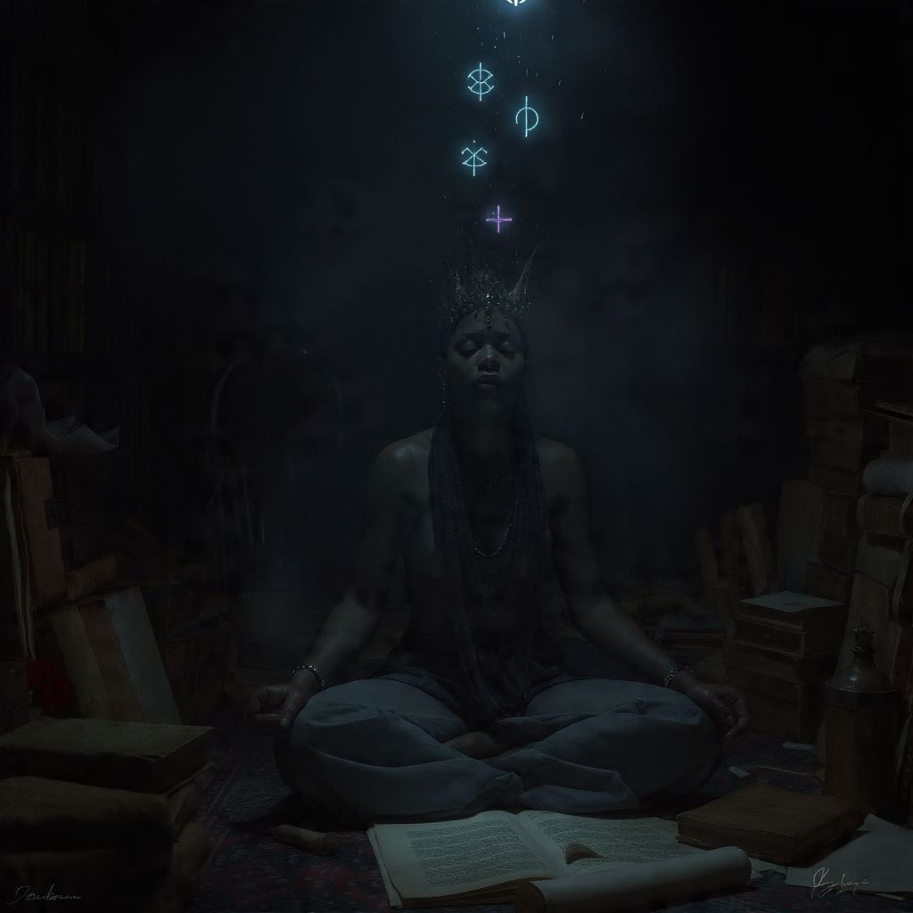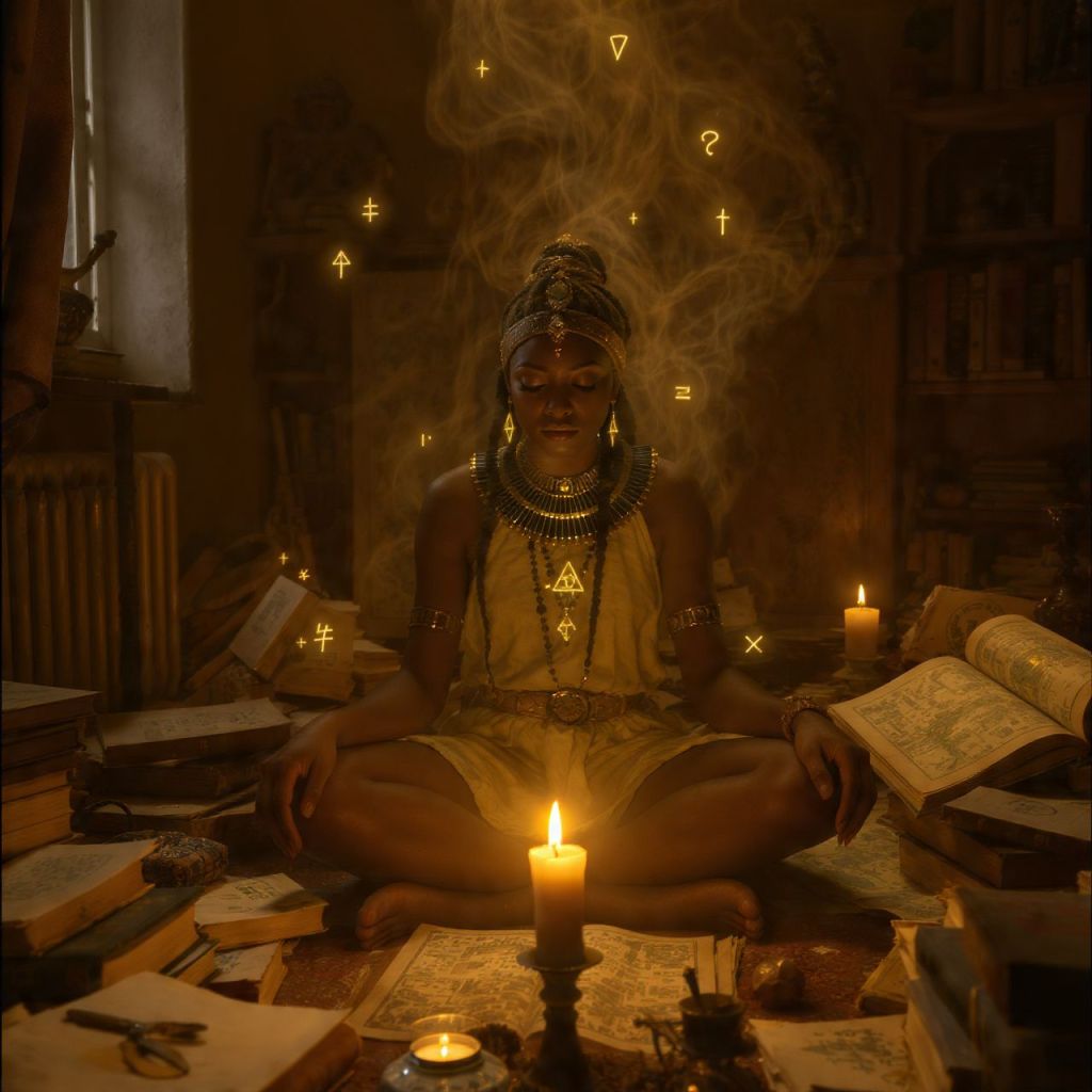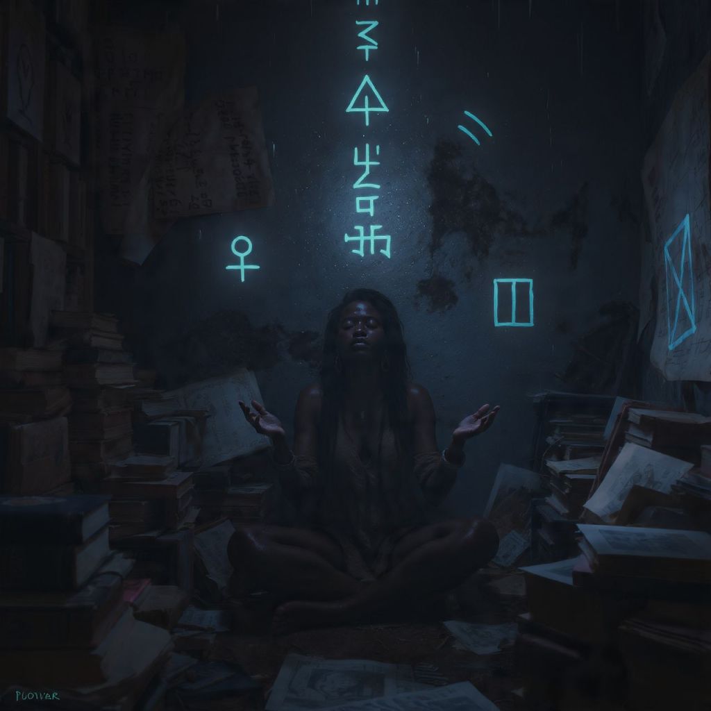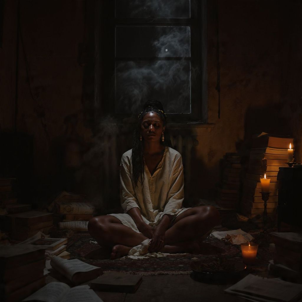 Thousands of voices whispering inside her consciousness — ancestors, angels, timelines, future versions of herself calling out: