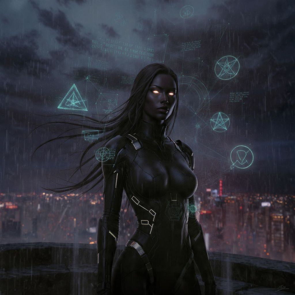 Her eyes turn white, ancient symbols reflect across her skin, and her voice becomes layered, powerful — echoing with multiple versions of herself: