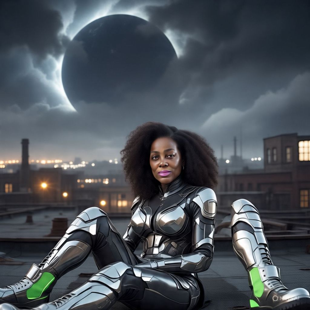 When she steps out, the sky is split in half — one side daytime, the other midnight black. A cosmic scar slicing across the sky.