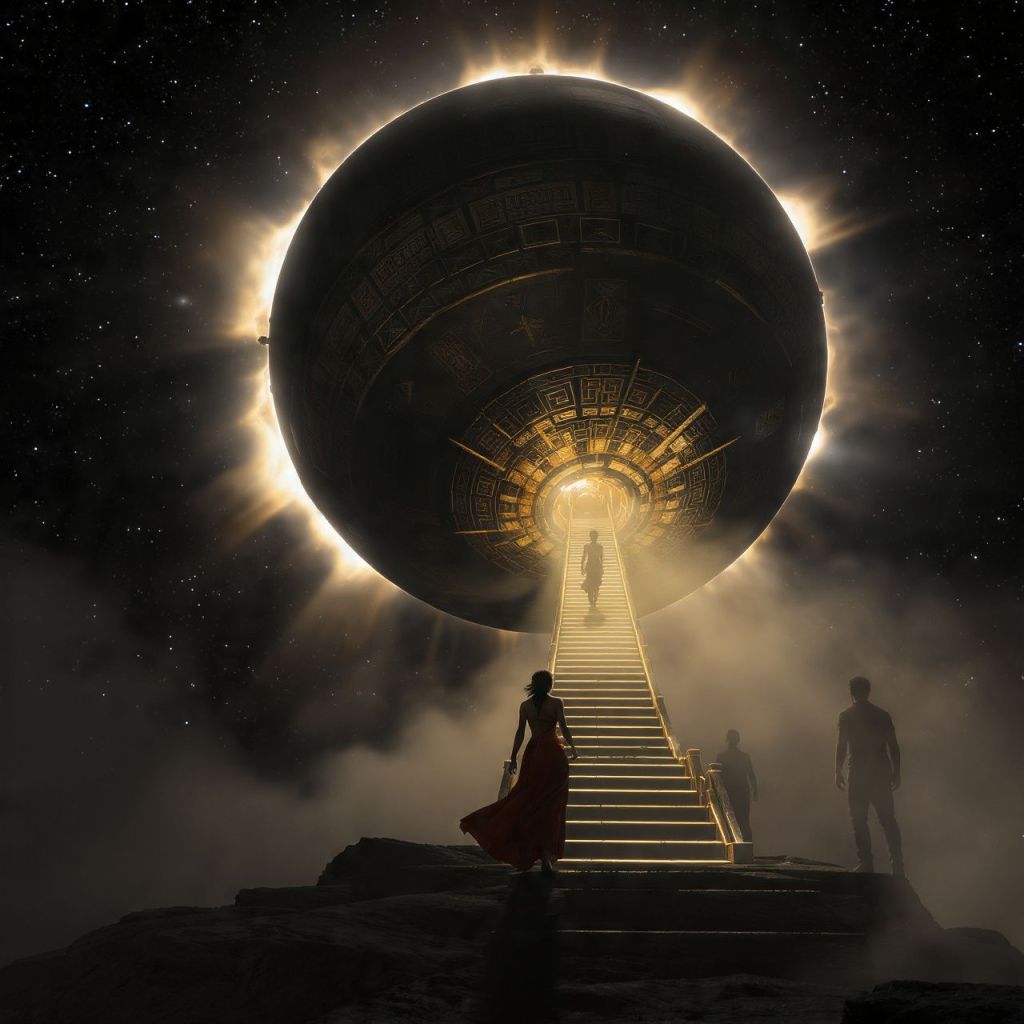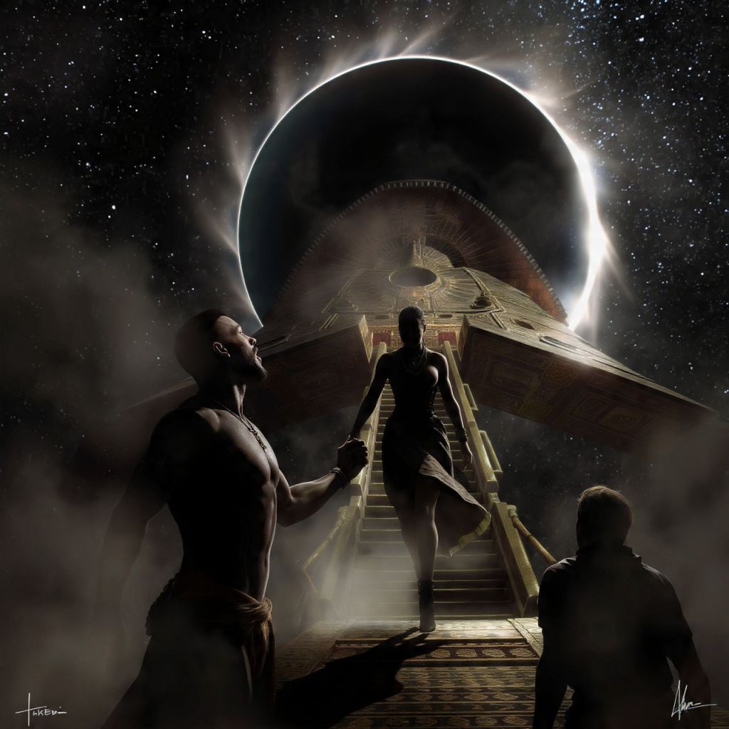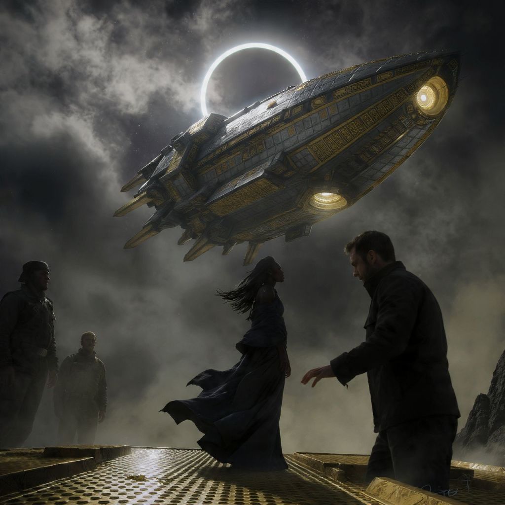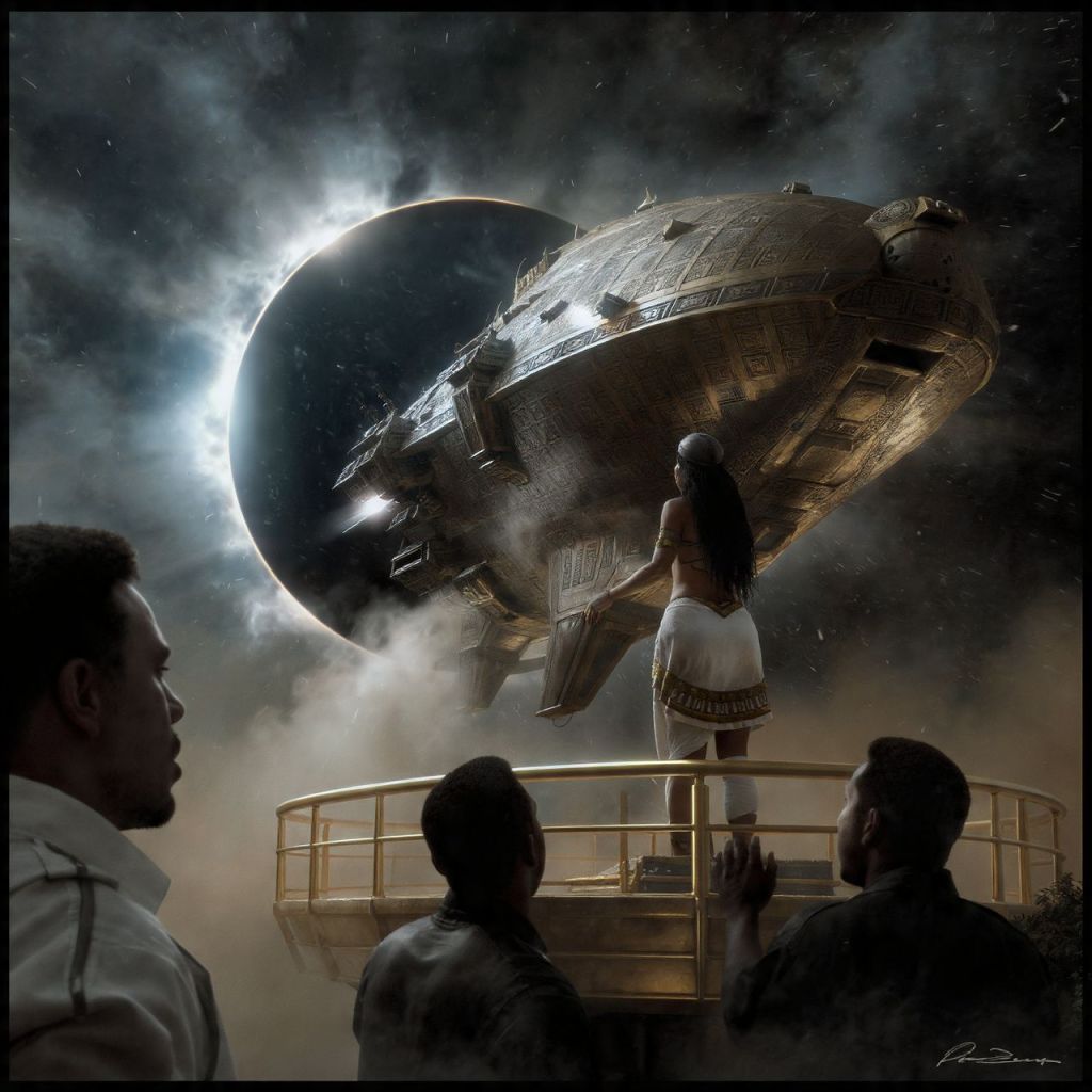 A massive spacecraft — ancient, Nubian, and divine — emerges from the eclipse.