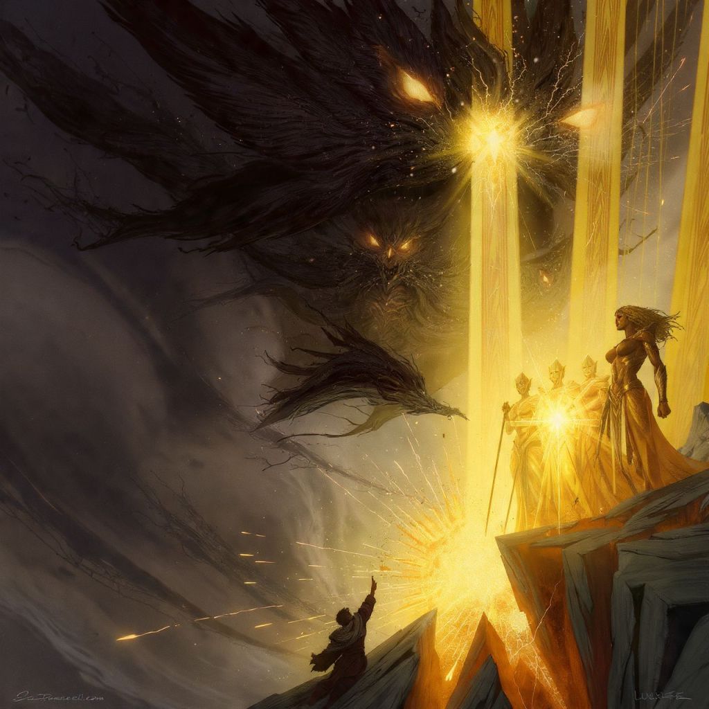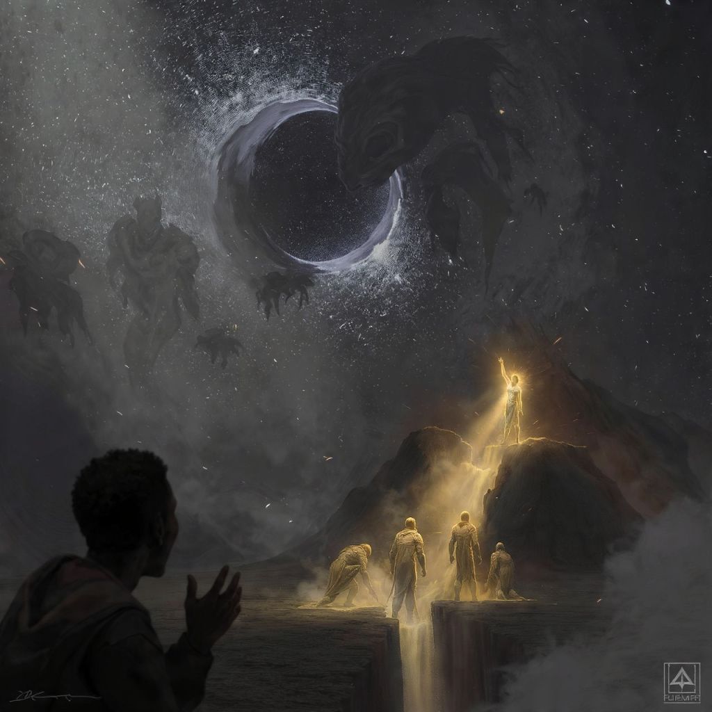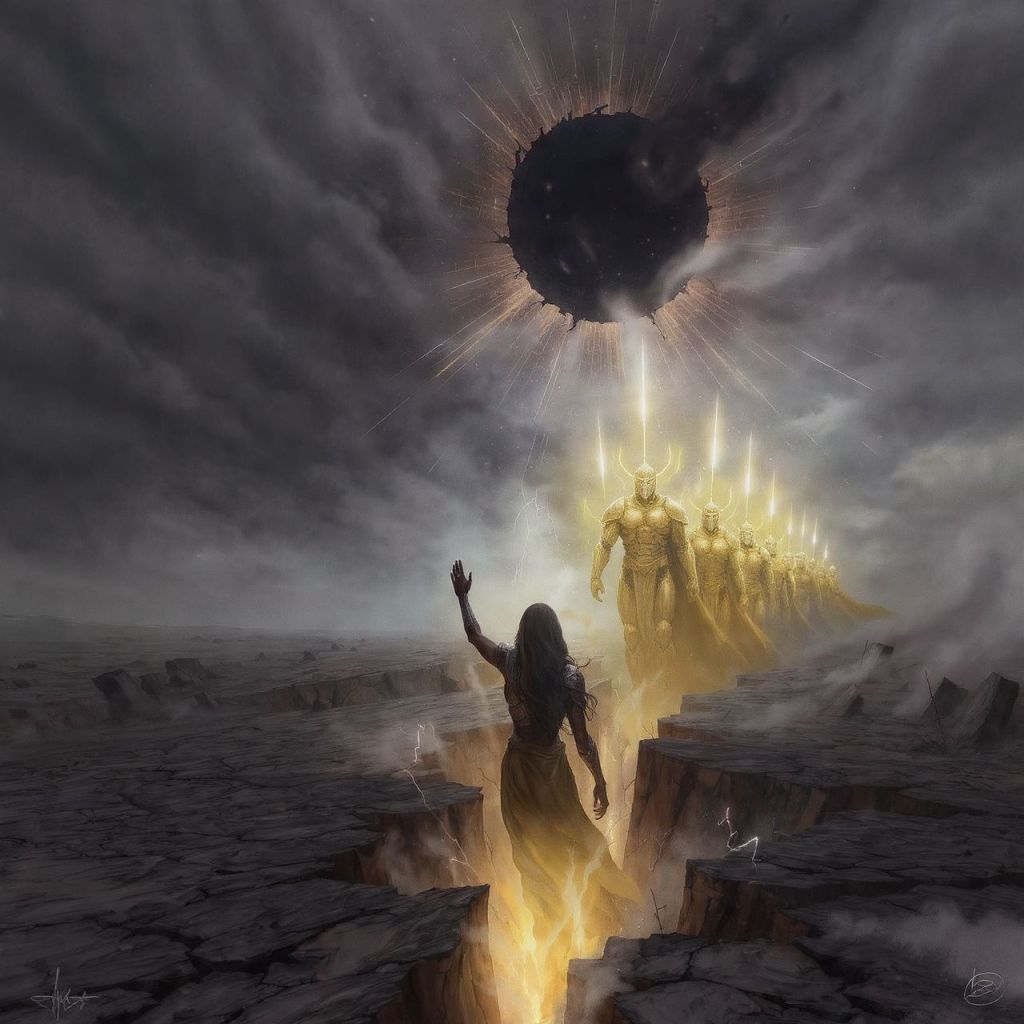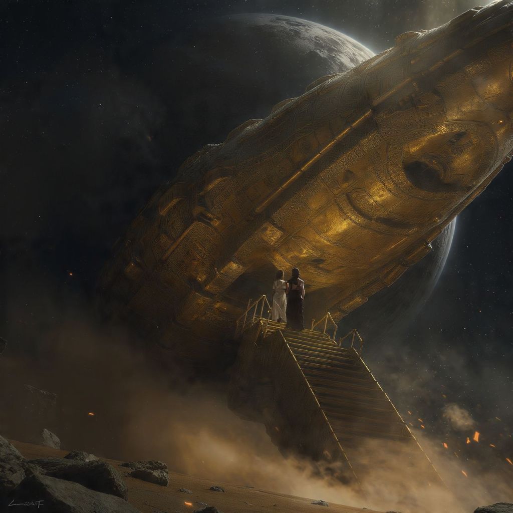 A massive spacecraft — ancient, Nubian, and divine — emerges from the eclipse.