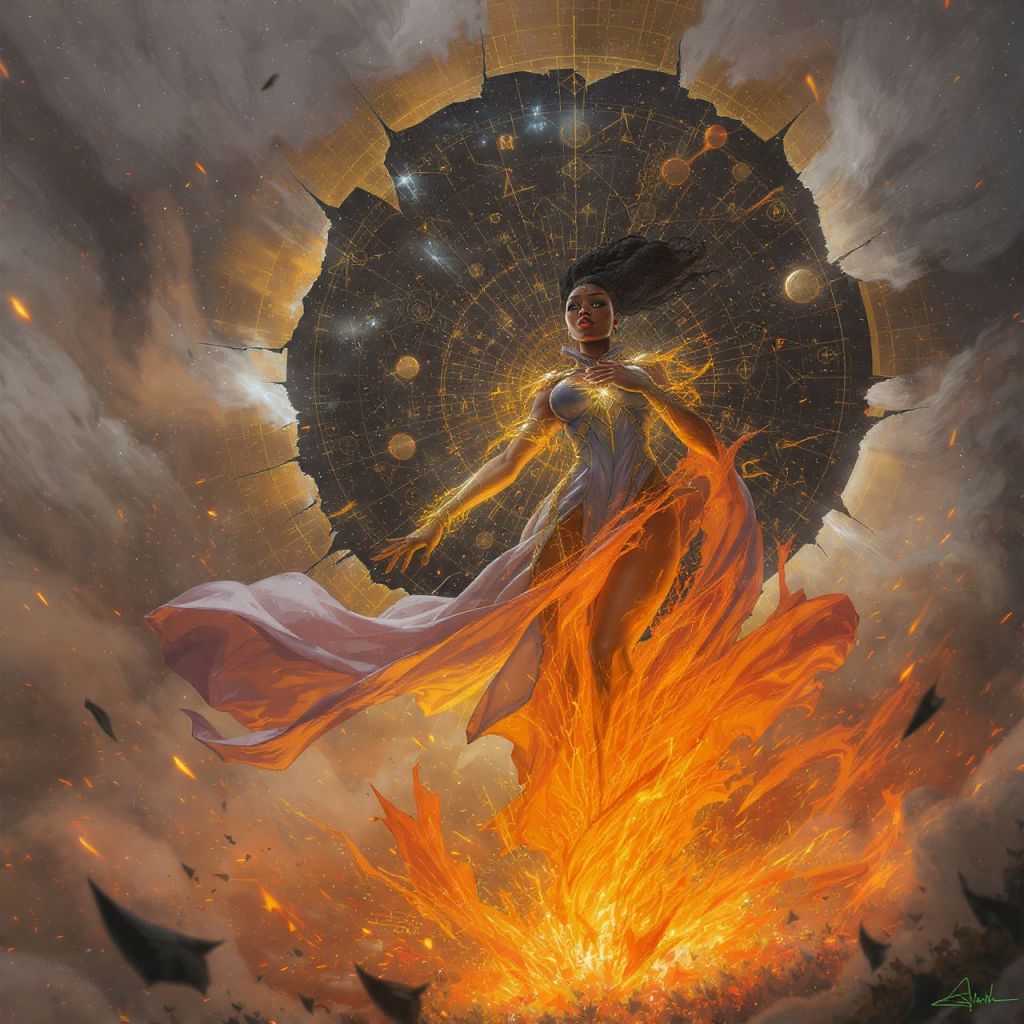 Antoinette stands in the middle of the chaos, calm, glowing, ascending in power.