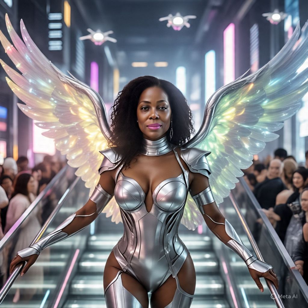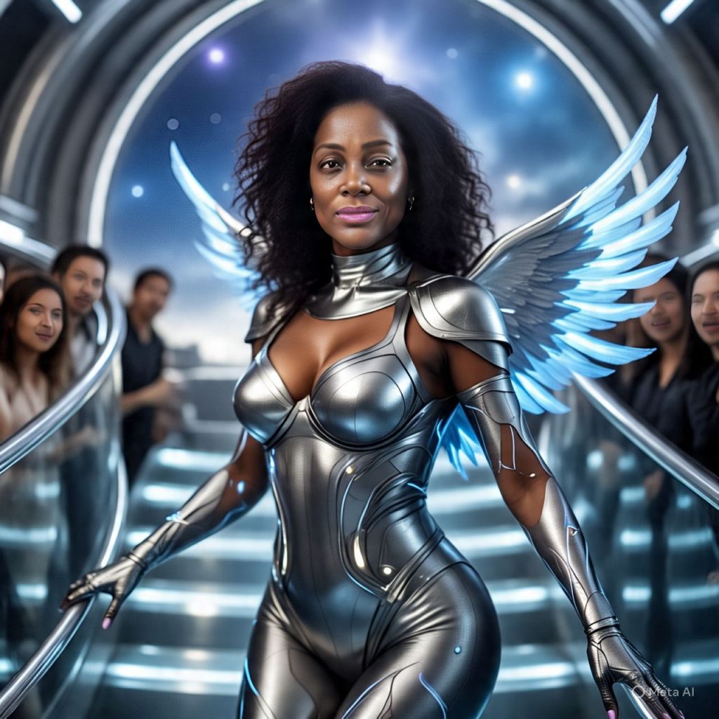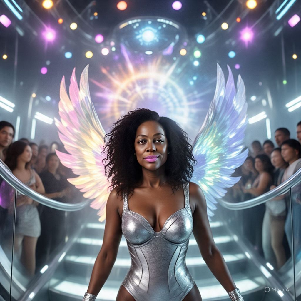 Inside the sky lounge, you descend a glass staircase in a shimmering silver body suit that looks half-angel, half-alien goddess. The crowd GASPS. Everyone feels it — the shift in the air.