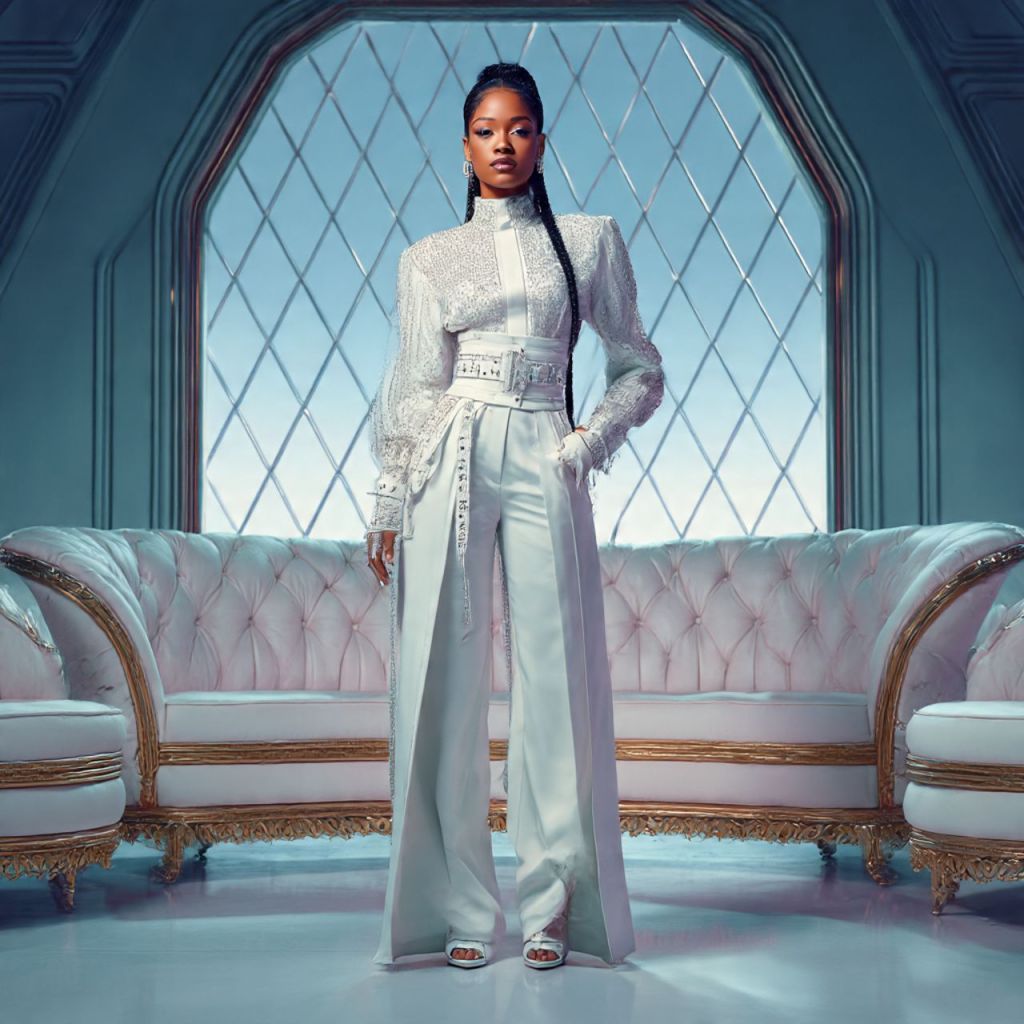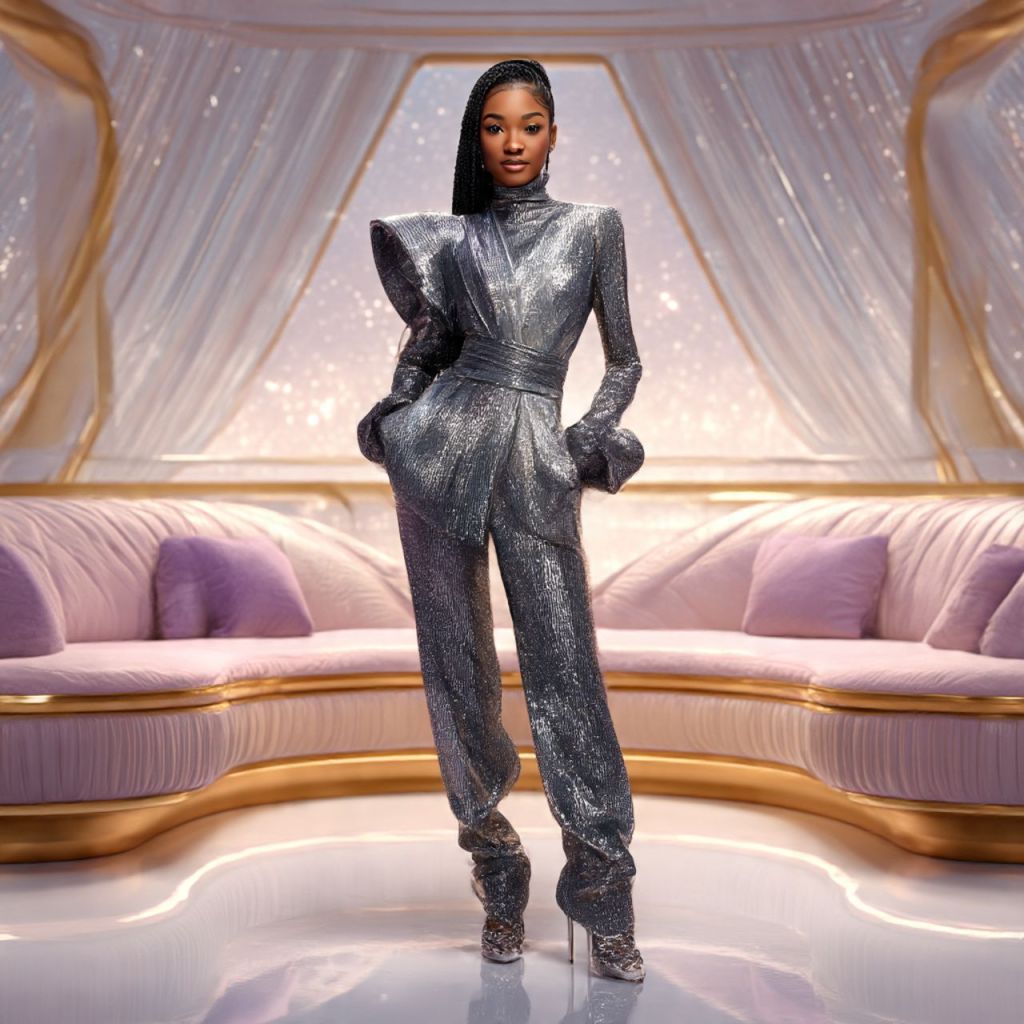 Suddenly KEKE PALMER slides into the room wearing a sparkling jumpsuit.