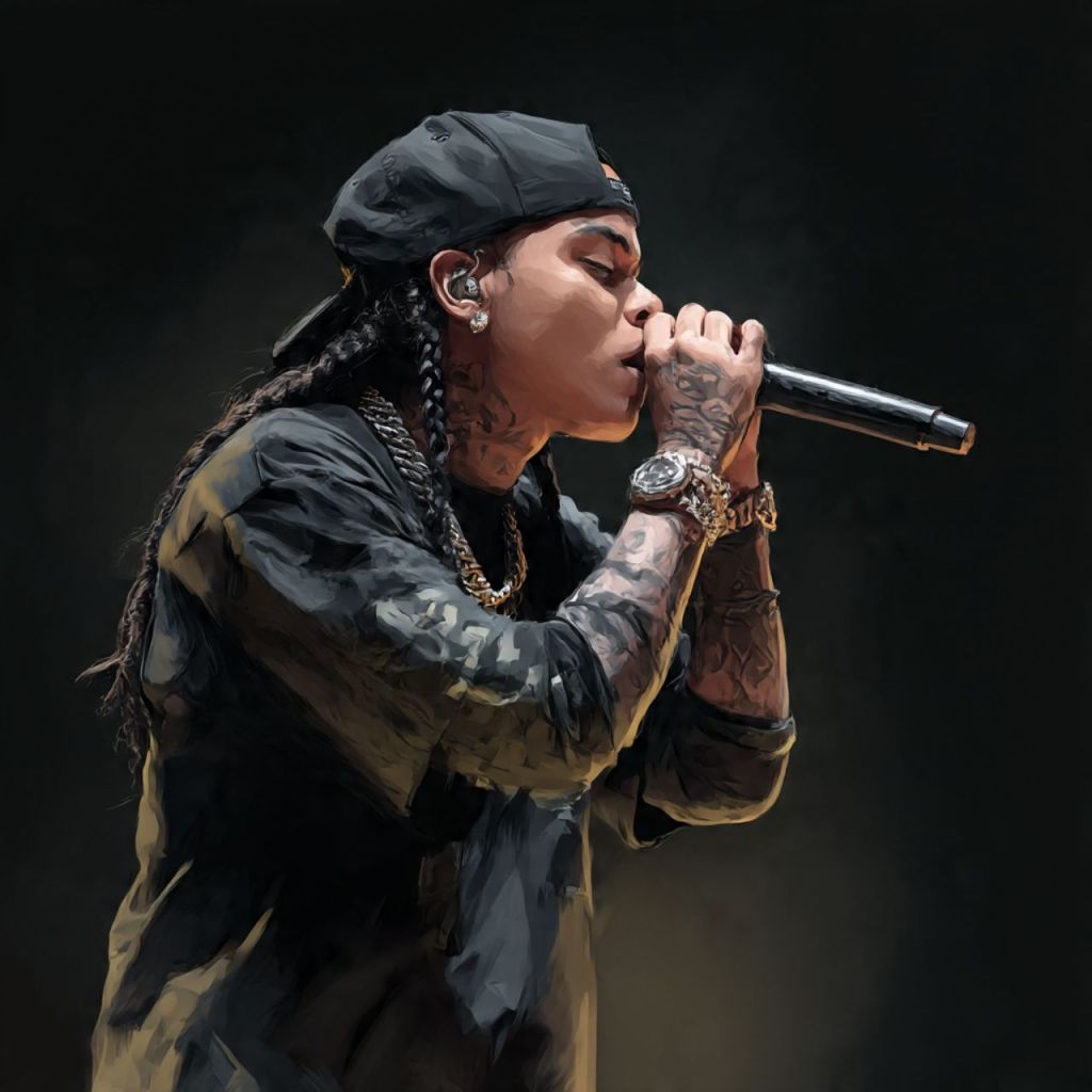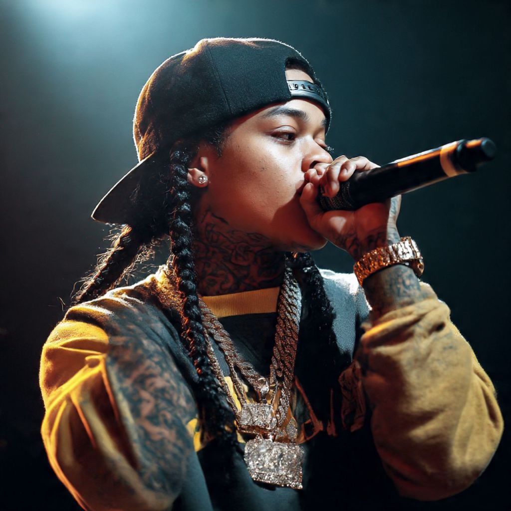 NLE Choppa pops out the floor platform — shirt open, chains swinging, high energy.