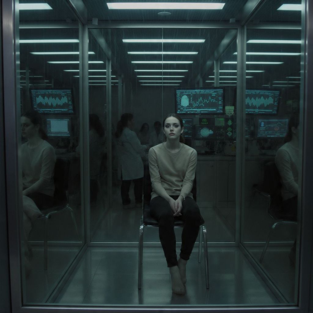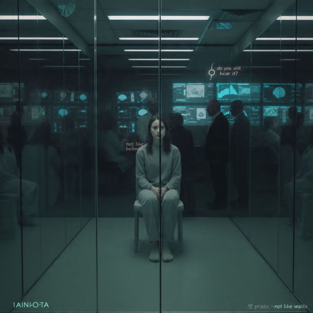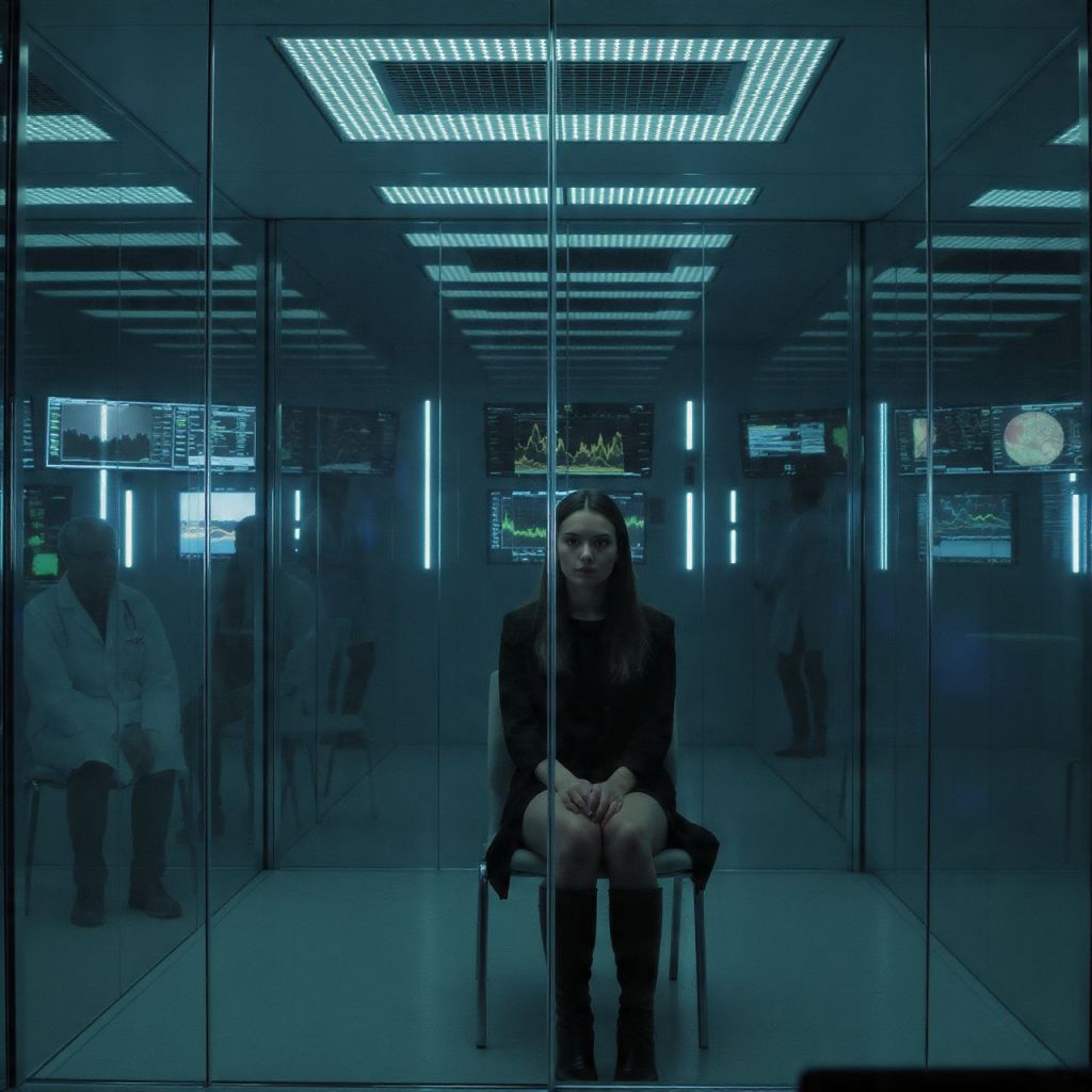 Aria sits alone in a glass room.